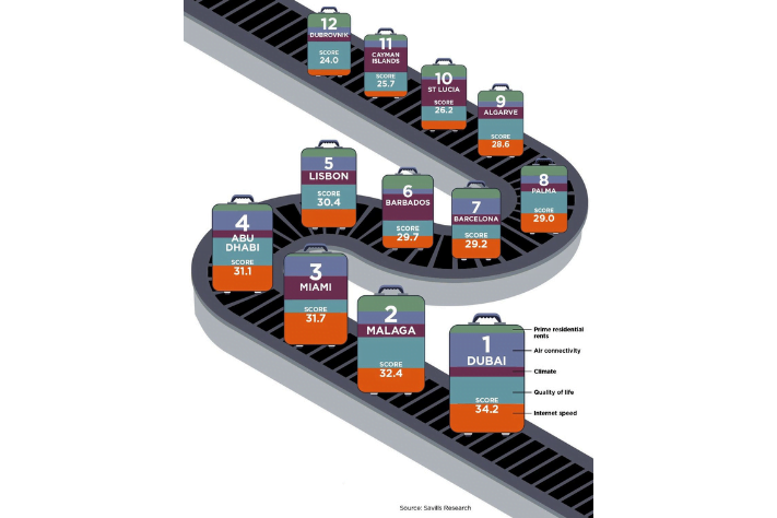 Não é de surpreender que as cidades globais Duvai, Málaga, Miami, Abu Dhabi e Lisboa ocupem os cinco primeiros lugares no último Savills Executive Nomad Index, que classifica os 20 destinos mais desejáveis do mundo para nómadas digitais com cargos superiores ou executivos.